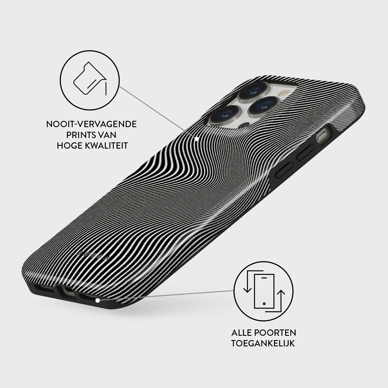Kenmerken van dit design: wervelende lijnen, golfpatroon, zwart-wit, optische illusie, abstract patroon