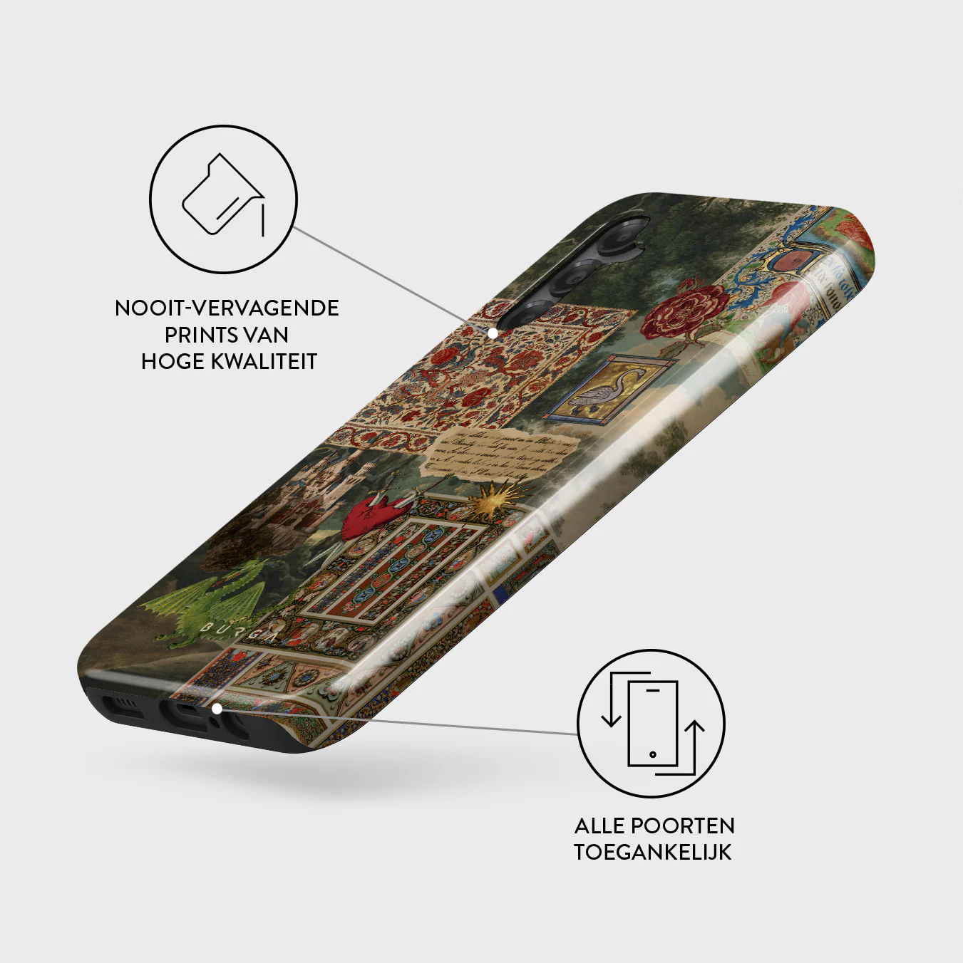 - Verhoogde randen rond de camera voor extra bescherming.