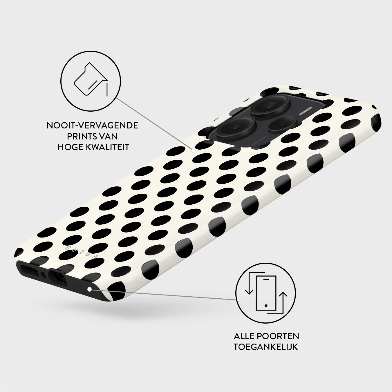 Kenmerken van dit design: zwarte stippen op een stralend witte achtergrond.