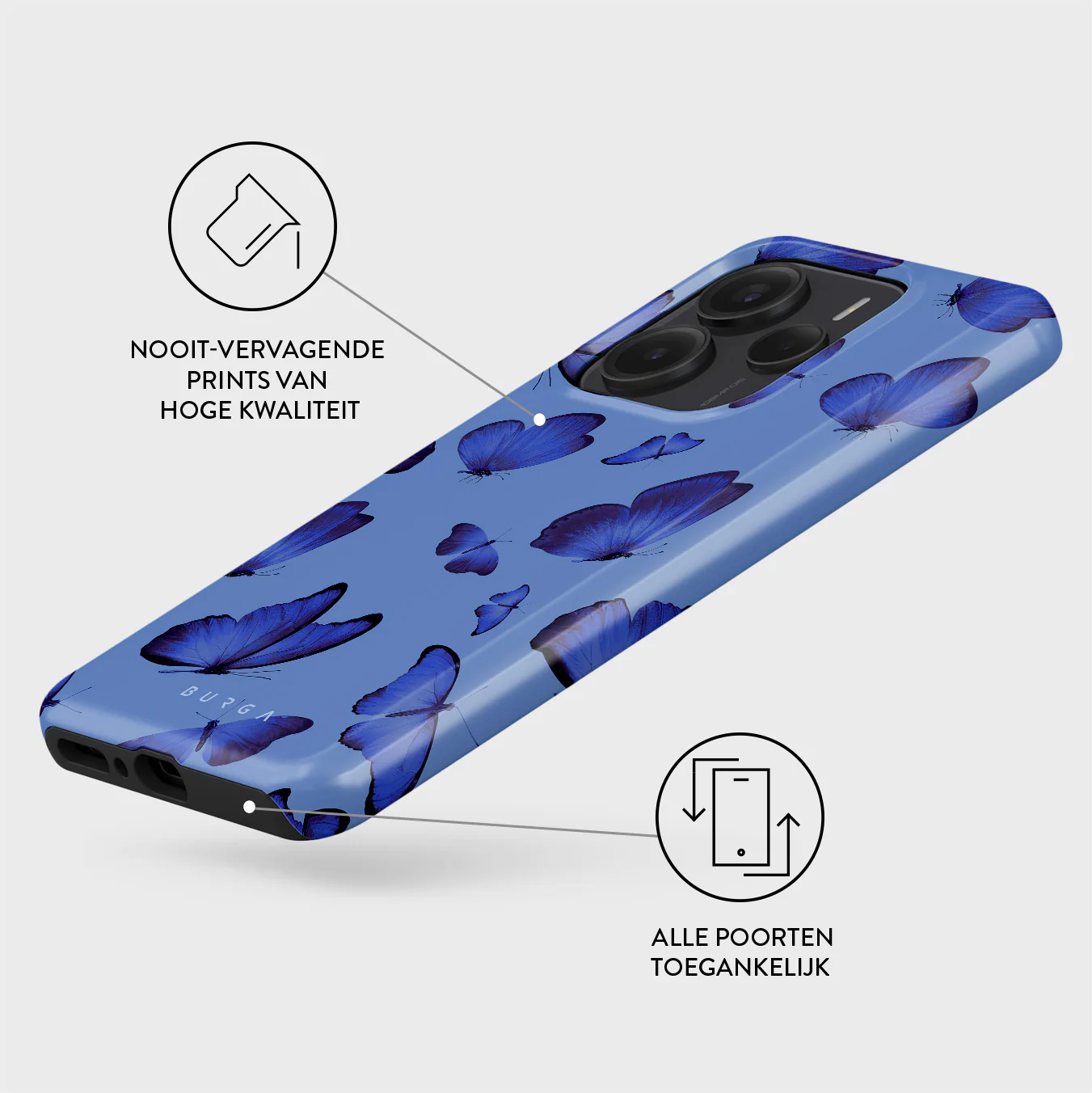 - Verhoogde randen rond de camera voor extra bescherming.