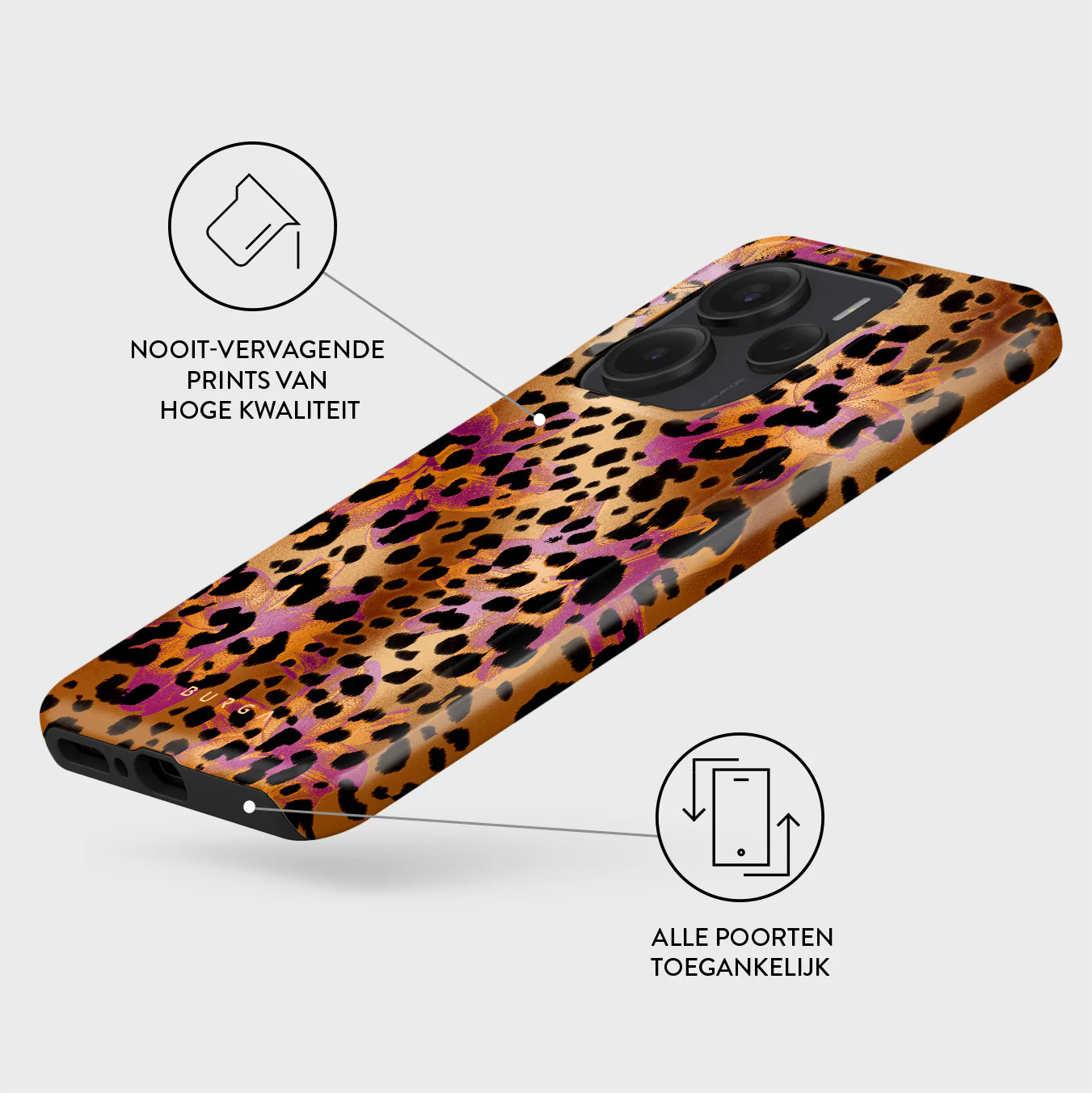 Kenmerken van dit design: luipaardprint, bruin, oranje, paars, dierenprint.