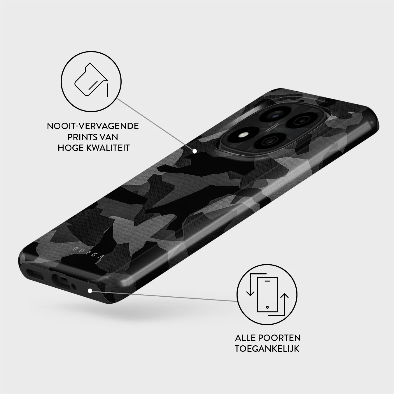 - Verhoogde randen rond de camera voor extra bescherming.